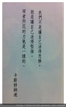 我在書上看到這句話,如果不想活得悲慘,就盡可能的為自己堅強,然後再從生活中找到一些小確幸來自我滿足。品味每一天,這就可以是我的大幸福。