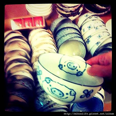 二、說一個令人害羞的小秘密,我十多歲的時後就開始想要跟愛人有個家,所以我以前的願望就是在20歲左右把自己嫁出去,然後每日以家為重,洗手做羹湯。當然這個願望是一直都沒有被我自己實現,但我從十九歲左右開始,跟同學逛百貨公司,我就會開始看很多鍋碗盤之類的餐具,然後搜括回家。現在我還是很愛逛菜市場,你知道菜市場就有很多天殺的可愛日本瓷器又賣的好便宜,下面這個豬碗我就買了一對,一個粉紅色一個藍色,現在跟外星人一人用一個,不知道是不是因為用豬碗的緣故,我真的越變越胖越吃越豬哩.....!